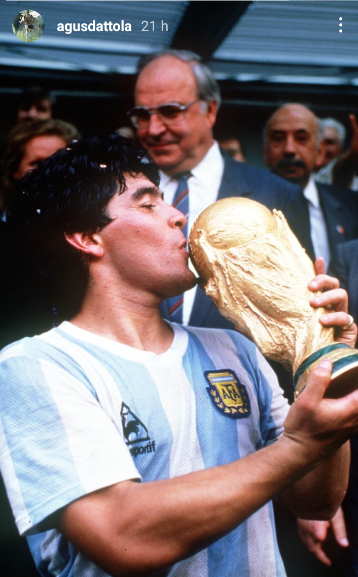 Los jugadores de Almirante Brown también se expresaron en las redes ante el acontecimiento del paso a la inmortalidad de Diego Maradona. Agustín Dattola (@agusdattola), defensor de Almirante Brown, subió una historia en Instagram de Maradona besando la Copa del Mundo conquistada en 1986.