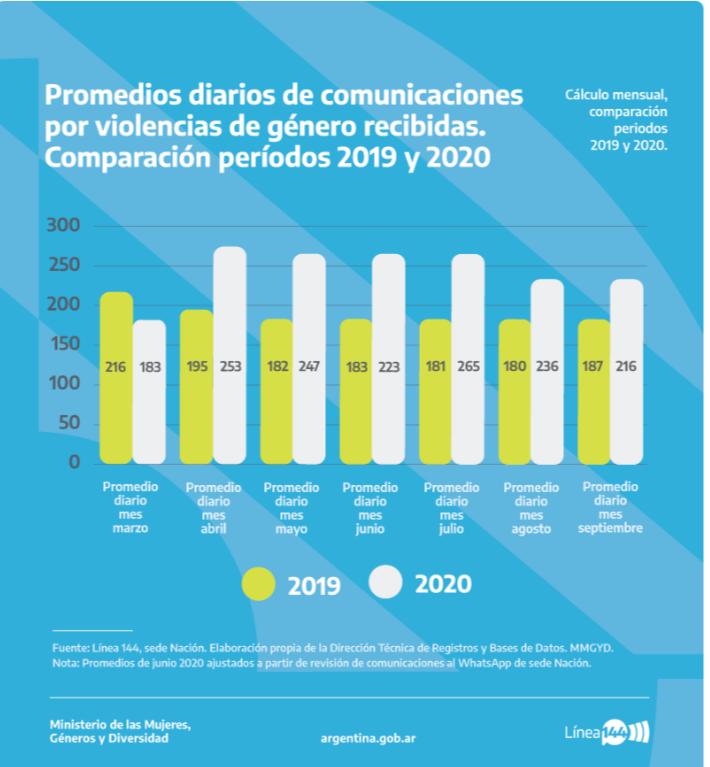 Los datos fueron creciendo durante los meses de aislamiento social, preventivo y obligatorio. En marzo de 2020, la línea 144 recibió 1124 comunicaciones más por violencia, en relación con el 2019. Por ejemplo, en abril, recibieron 1735 comunicaciones más, y en septiembre el número fue de 866 comunicaciones más.