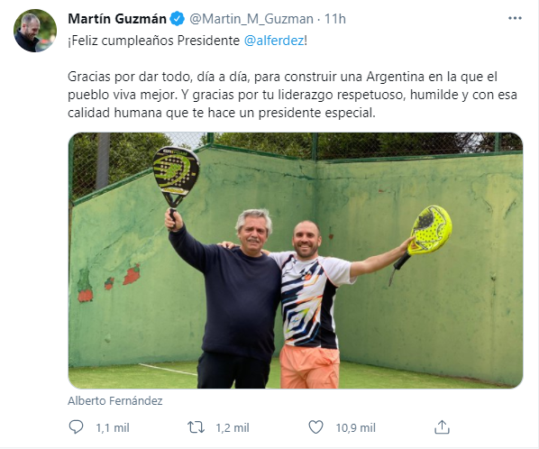Un tweet compartido por el presidente es el del ministro de Economía, Martín Guzmán, quien compartió una foto de ambos luego de jugar al pádel. “Gracias por dar todo, día a día, para construir una Argentina en la que el pueblo viva mejor. Y gracias por tu liderazgo respetuoso, humilde y con esa calidad humana que te hace un presidente especial”, escribió el funcionario.