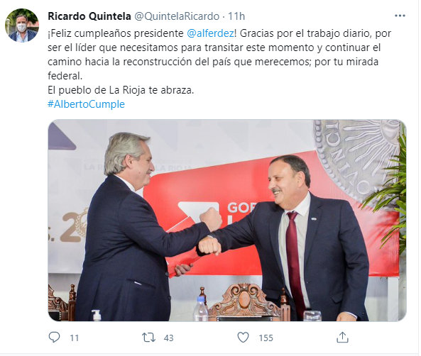 El gobernador de La Rioja, Ricardo Quintela, le envió un “abrazo”; por parte del “pueblo riojano” y le agradeció “el trabajo diario” como así también por “ser el líder que necesitamos para transitar este momento y continuar el camino hacia la reconstrucción del país que merecemos; por tu mirada federal”.