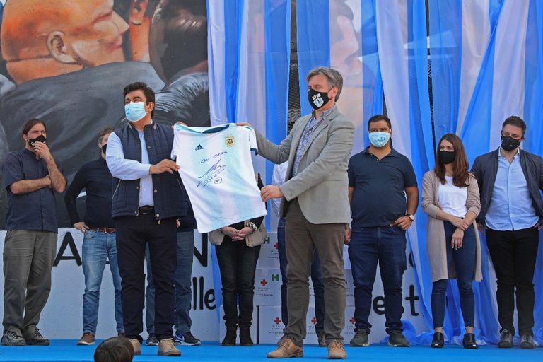 El ídolo donó camisetas firmadas a diez localidades de distintas provincias. El objetivo era recaudar fondos para asistencia alimentaria y obras de infraestructura. En Villa Palito el fin fue la revalorización del Polideportivo Padre Bachi, en honor al cura recientemente fallecido, para que los chicos jueguen seguros. El astro también hizo llegar elementos de higiene, alcohol en gel, lavandina y tapabocas. El “potrero”, como lo nombró Maradona, inauguró un mural con los goles a los ingleses en el Mundial 86, que se convirtió en santuario luego de su fallecimiento.