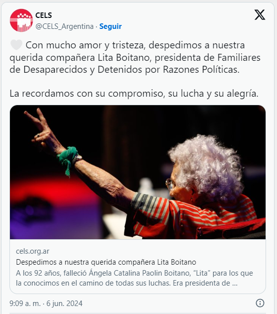 Políticos, intelectuales y referentes de Derechos Humanos manifestaron su pesar y resaltaron la figura de Lita Boitano en sus redes, conocida la noticia de su muerte.