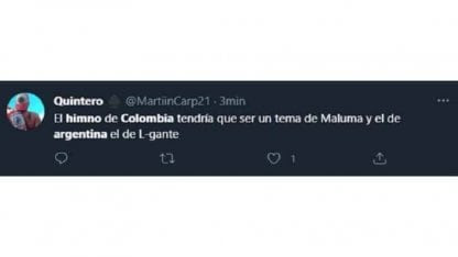 Himnos al ritmo de L-Gante y Maluma, la propuesta para Argentina y Colombia.En Twitter, durante la entonación de las estrofas sagradas, bromearon con que el himno de Argentina tendría que ser una canción de L-Gante, mientras que la de Colombia una de Maluma.