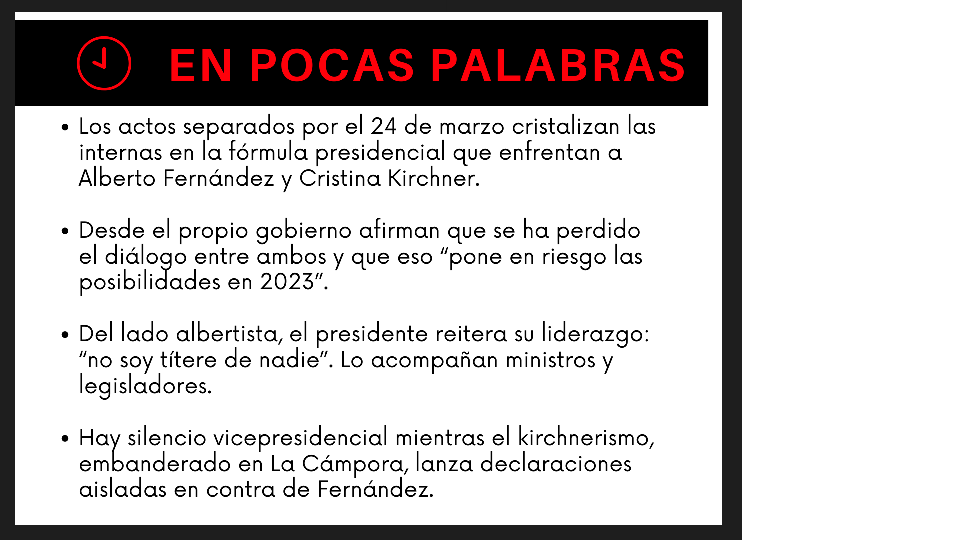 La bifurcación de convocatorias por el Día de la Memoria por la Verdad y la Justicia conmemorado el 24 de marzo no hizo sino confirmar la tendencia que hace semanas comenzaba a gestarse en el oficialismo: hay internas en el gobierno, y enfrentan nada más y nada menos que al presidente Alberto Fernández y a su vice Cristina Kirchner. Por su trascendencia política e incluso por sus anticipadas consecuencias electorales, el desencuentro merece explicarse en detalle. ¿Coalición o colisión?