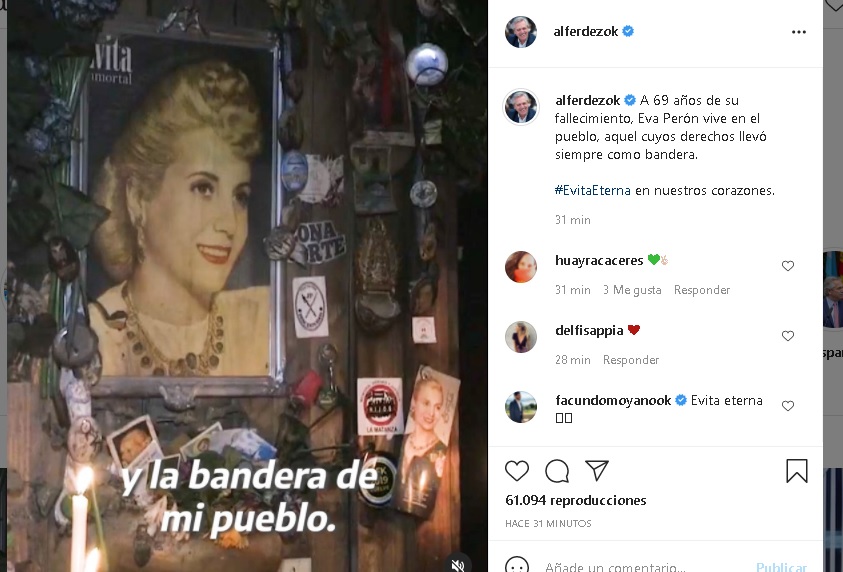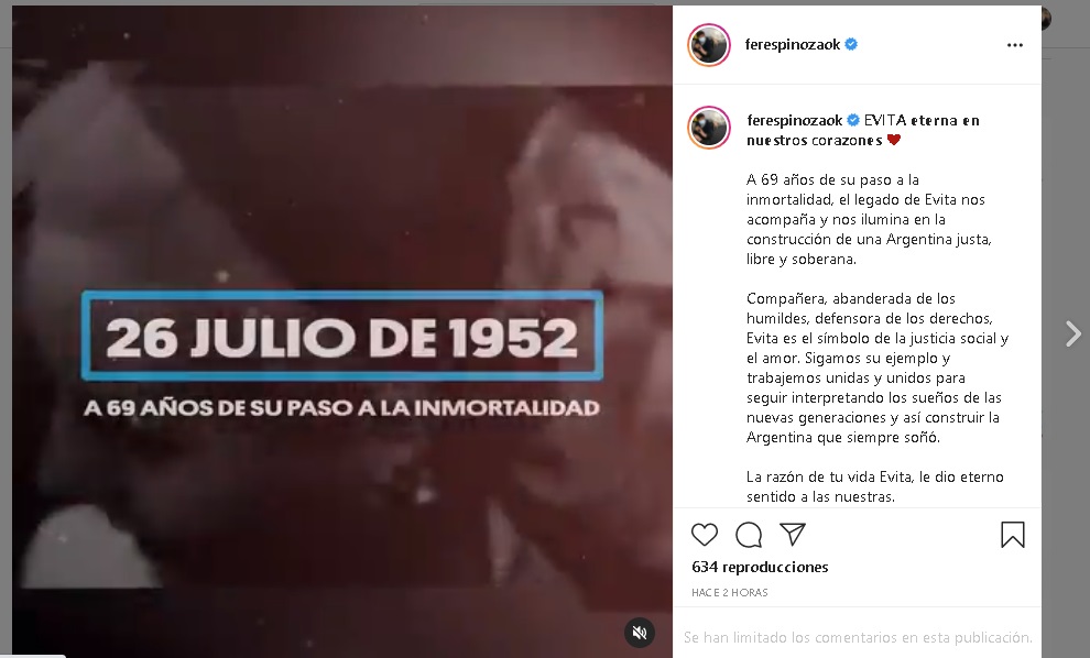 El intendente de La Matanza, Fernando Espinoza posteó en su Instagram un video con imágenes y frases cruciales de la dirigente política. Además, en la descripción escribió que “el legado de Evita nos acompaña y nos ilumina en la construcción de una Argentina justa”. Así mismo, Espinoza agregó: “Compañera, abanderada de los humildes y defensora de los derechos, Evita es el símbolo de la justicia social y el amor”.