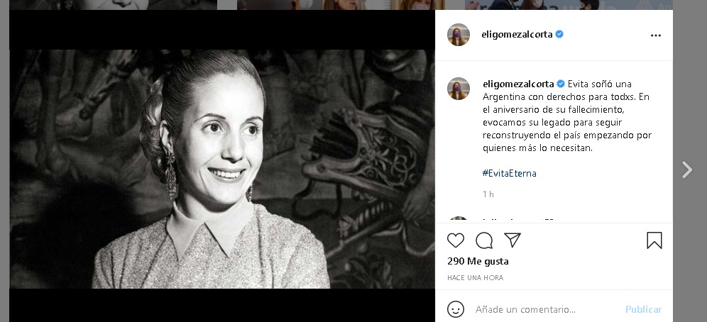 La ministra de Mujeres, Géneros y Diversidad de la Nación, Elizabeth Gómez Alcorta hizo su homenaje en su cuenta de Instagram. Con una foto de Eva Perón sonriendo, expresó que “Evita soñó una Argentina con derechos para todxs. En el aniversario de su fallecimiento, evocamos su legado para seguir reconstruyendo el país empezando por quienes más lo necesitan”.