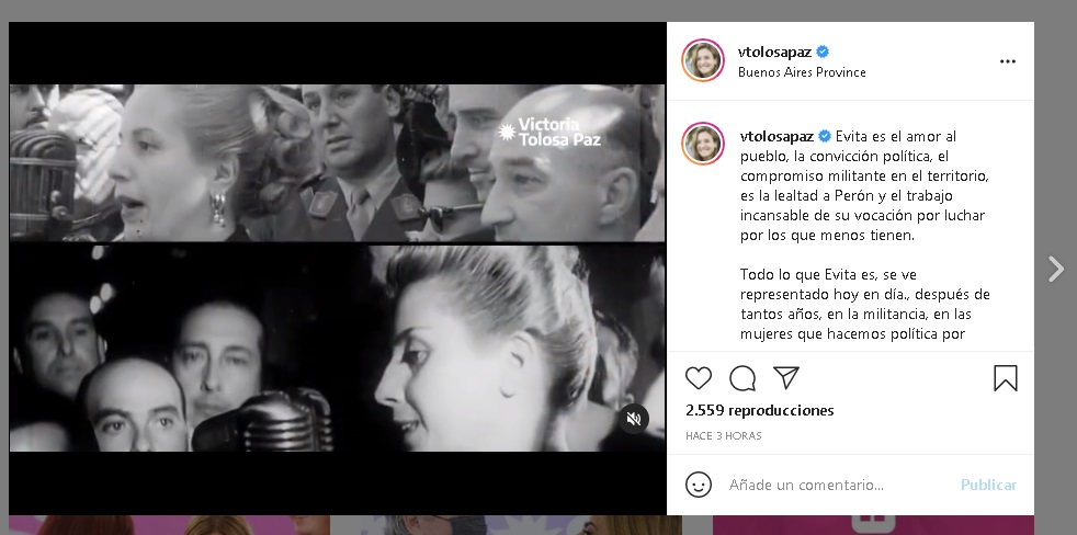 En el mismo sentido, la concejal del Partido de La Plata, Victoria Tolosa Paz publicó un video recordando los discursos históricos de Evita. Al verla como pieza fundamental en la participación política de las mujeres, Paz manifestó que “todo lo que Evita es, se ve representado hoy en día, en las mujeres que hacemos política por convicción y amor a nuestro pueblo”.
