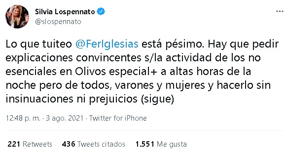 “Lo que tuiteó Fernando Iglesias está pésimo”, declaró la diputada del PRO, Silvia Lospennatola. También advirtió que se deben pedir explicaciones sobre las distintas actividades que realizan los trabajadores no esenciales en Olivos. Asimismo, aseguró que estas aclaraciones se le deben pedir a todos, tanto varones como mujeres, y que deben ser requeridas sin insinuaciones ni prejuicios.