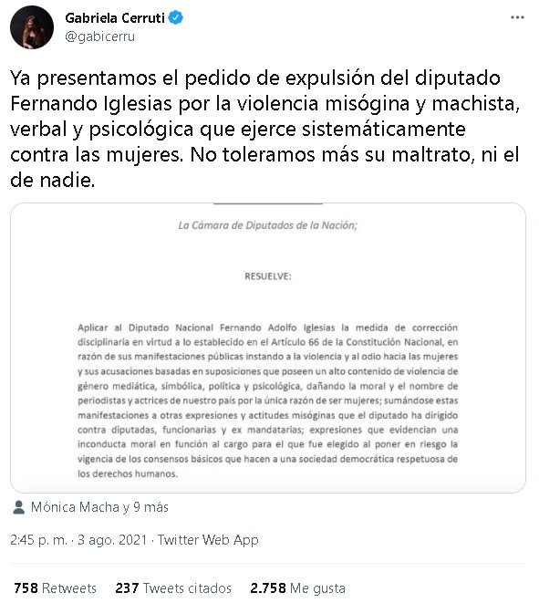 “Ya presentamos el pedido de expulsión del diputado Fernando Iglesias por la violencia misógina y machista, verbal y psicológica que ejerce sistemáticamente contra las mujeres”, twitteó Cerruti. Además, la diputada agregó que no se tolerará más el maltrato por parte de Iglesias ni por parte de nadie.