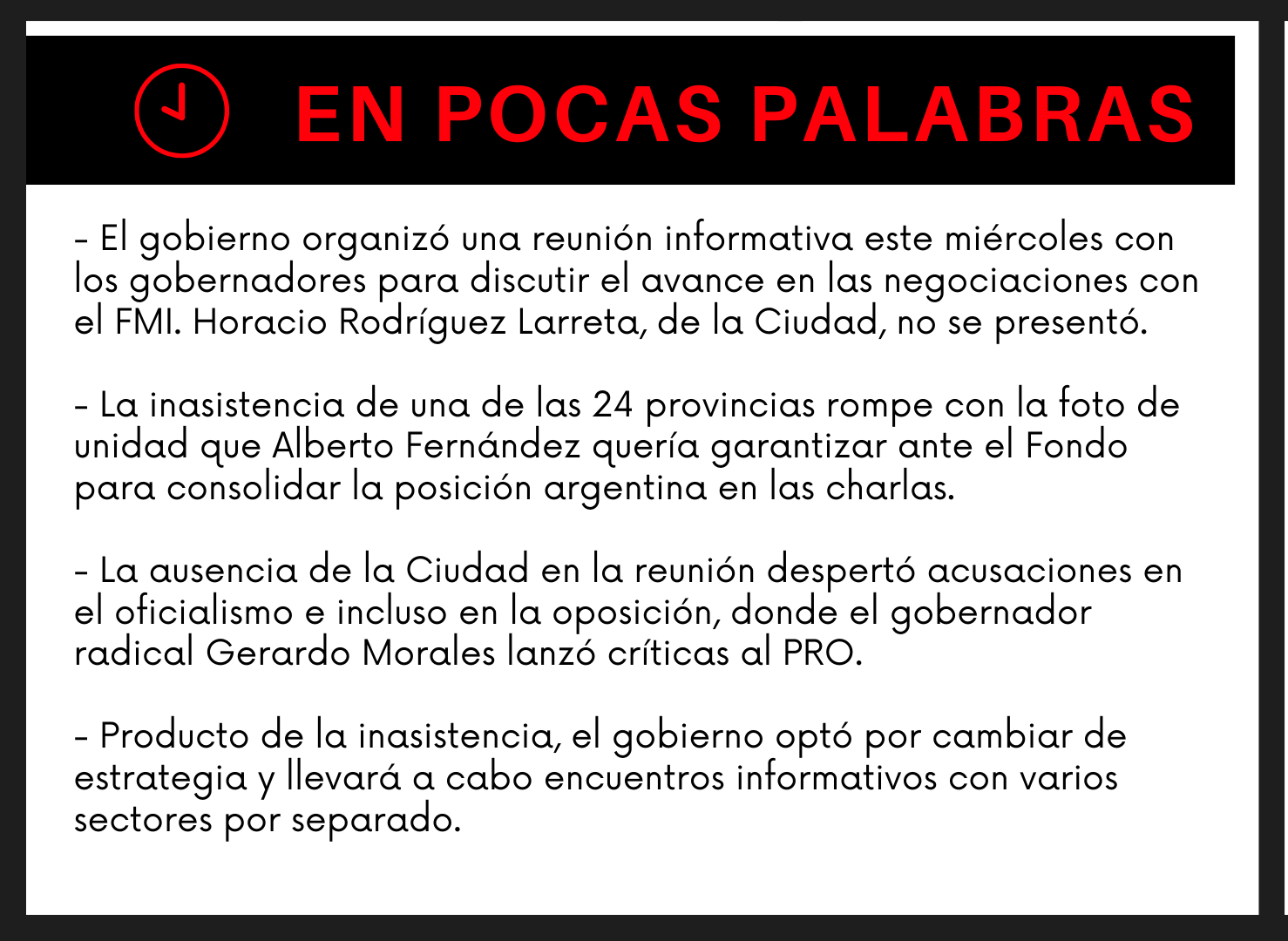 Una sola silla estuvo vacía en el Museo del Bicentenario el miércoles, durante la reunión que mantuvieron el gobierno de Alberto Fernández y los gobernadores del oficialismo y la oposición para discutir los avances de la negociación con el Fondo Monetario Internacional (FMI). La banca pertenecía a la Ciudad de Buenos Aires, la única jurisdicción en ausentarse al mitin federal. El desencuentro disparó broncas cruzadas por una razón: impide la foto de unidad para presentar al Fondo en muestra de respaldo federal al acuerdo. ¿Y ahora?