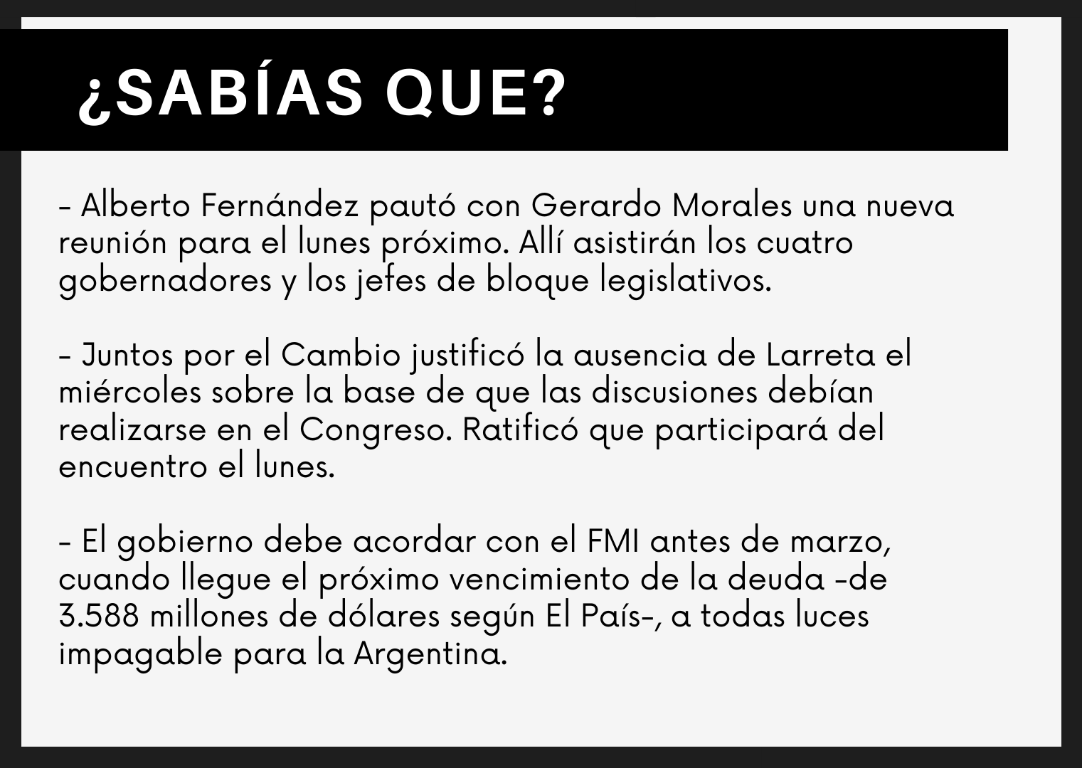 El apoyo político al gobierno vendrá en cuotas, en medio de unas desaceleradas conversaciones con el FMI que deben concretarse antes de marzo, cuando vencerá una impagable porción de la deuda a reestructurar. El oficialismo se vio obligado a cambiar de estrategia luego de que el jefe de Gobierno porteño Horacio Rodríguez Larreta y los gobernadores Gustavo Valdés (Corrientes), Rodolfo Suárez (Mendoza) y Gerardo Morales (Jujuy) no asistieran a la Casa Rosada. Los tres radicales enviaron funcionarios provinciales, mientras que la Ciudad se abstuvo por completo.