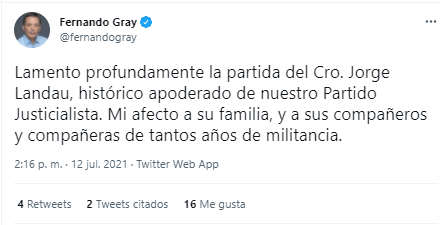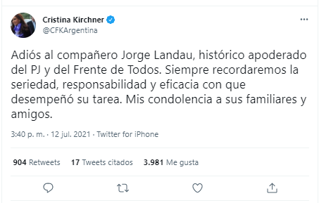 El presidente de la Nación, Alberto Fernández, también despidió al funcionario: “Lamento el fallecimiento de Jorge Landau, apoderado histórico y estimado del @p_justicialista . Con profundo pesar quiero expresar mi acompañamiento en su dolor a su familia y allegados. Gracias por su trabajo, su honestidad y su compromiso con el peronismo”.