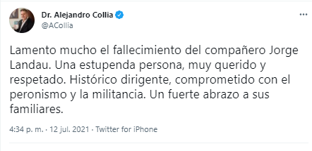 El Subsecretario de Gestión de Servicios e Institutos del Ministerio de Salud de la Nación, Alejandro Collia también se manifestó. “Lamento mucho el fallecimiento del compañero Jorge Landau. Una estupenda persona, muy querido y respetado. Histórico dirigente, comprometido con el peronismo y la militancia. Un fuerte abrazo a sus familiares”.