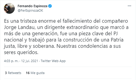 Fernando Espinoza, intendente de La Matanza, publicó en su twitter. “Es una tristeza enorme el fallecimiento del compañero Jorge Landau”. Además, agregó que él era “un dirigente extraordinario que marcó a más de una generación, fue una pieza clave del PJ nacional y trabajó para la construcción de una Patria justa, libre y soberana”. “Nuestras condolencias a sus seres queridos”, finalizó.