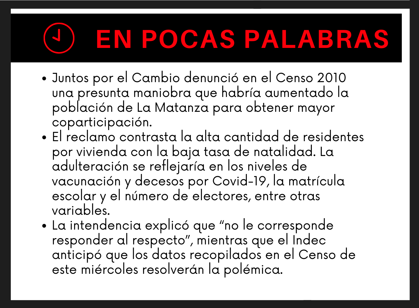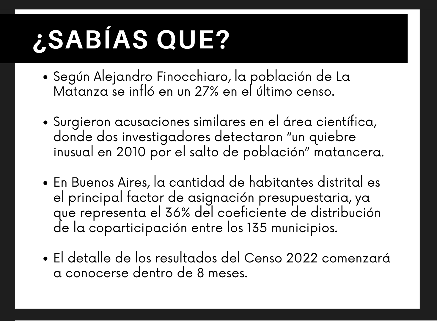 Tras el relevamiento demográfico que arrojó un total de 1.775.816 residentes matanceros en 2010, un grupo de legisladores de Juntos por el Cambio encabezados por el exministro de Educación Alejandro Finocchiaro denunciaron una supuesta adulteración de datos en el municipio más extenso y populoso del conurbano bonaerense. La cifra implicaría que la población de La Matanza se aumentó artificialmente en un 27%, asegura el excandidato a intendente según Letra P.