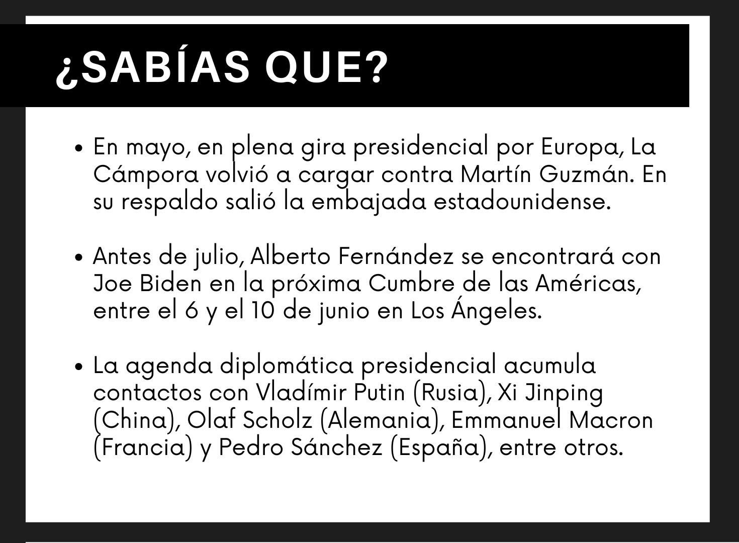 A inicios de mayo, el jefe de Estado protagonizó una recorrida diplomática por Europa que lo llevó a encontrarse con el canciller alemán Olaf Scholz y los presidentes de Francia Emmanuel Macron y de España Pedro Sánchez. Aunque un propósito lateral de las visitas era cambiar política nacional por internacional, el viaje se mezcló otra vez con discusiones domésticas; con la novedad de que en ellas tomaron voz nada menos que Fernández y la vicemandataria Cristina Kirchner.