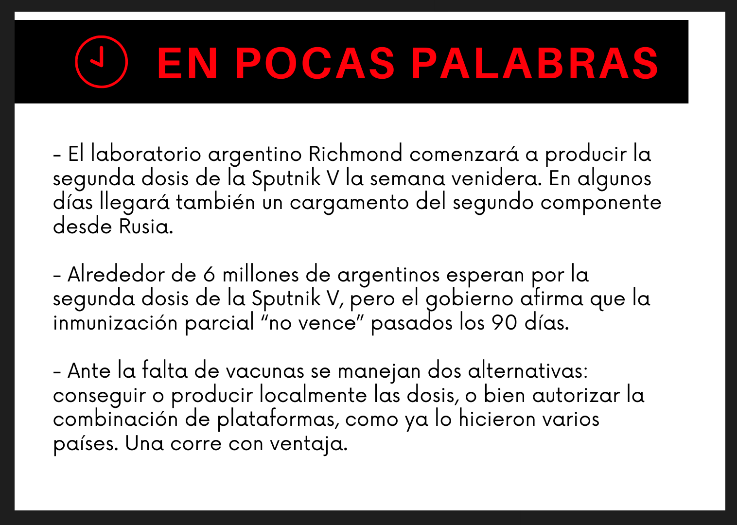 El Instituto Gamaleya, el centro de investigación ruso que desarrolló la vacuna Sputnik V, anunció este jueves que el laboratorio Richmond comenzará la producción nacional de la segunda dosis del inmunizante contra el Coronavirus la próxima semana. Además, el organismo informó que enviará un cargamento con el segundo componente en los días venideros. Las comunicaciones se dan en un contexto de incertidumbre porque la Argentina recibió hasta ahora más de 7 millones de dosis del primer inoculante pero solo 1.280.000 del segundo. Sin embargo, el gobierno nacional maneja sus alternativas. ¿Hay que preocuparse? Sputnik V segundas dosis