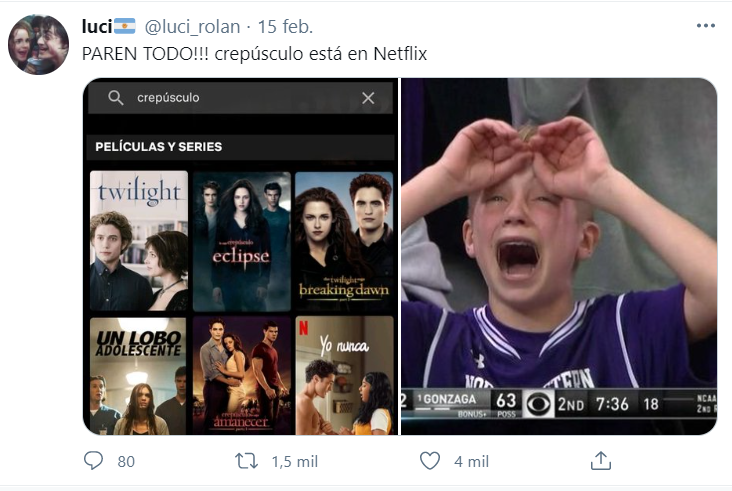 En cuanto a entretenimientos, #Crepúsculo, obtuvo 14,5 tweets porque sus películas ya están disponibles en Netflix, y el público adolescente y adulto celebra el estreno de la saga romántica .