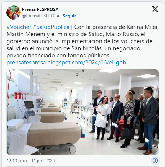 Un documento de la Fesprosa sostuvo que la decisión oficial es “una vieja idea del Banco Mundial (BN), ya fracasada en los años ’90”, y señaló que el Ejecutivo libertario -asociado a la intendencia del municipio bonaerense de San Nicolás- lanzó el Seguro Médico Municipal, que rebautizó de manera pomposa “voucher de salud”, y enfatizó que “la idea de subsidiar la demanda, es decir, a la población sin cobertura, y no a la oferta, fue planteada por ese organismo de crédito internacional en aquellos años liberales como parte integrante de la estrategia del avance de ese sistema político”.