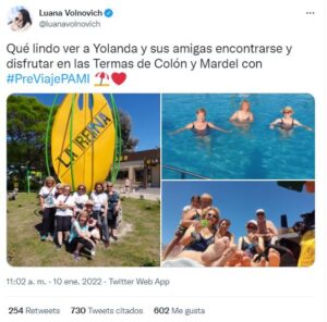 De hecho, hace pocos días, Volnovich compartió en su cuenta de Twitter la experiencia de una jubilada que aprovechó el PREVIAJE PAMI. “Qué lindo ver a Yolanda y sus amigas encontrarse y disfrutar en las Termas de Colón y Mardel con #PreViajePAMI”, publicó la funcionaria junto con tres imágenes de las viajeras.