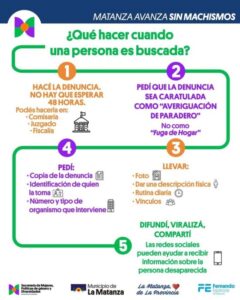 El programa de La Matanza “Si las buscamos, no desaparecen” ayuda a encontrar a niñas, mujeres o persona desaparecida, que se ausentas de sus hogares por días o horas. El programa cuenta con diferentes áreas y organismos que ayudan a buscar solución a las situaciones de desaparición de La Matanza por distintos motivos.
